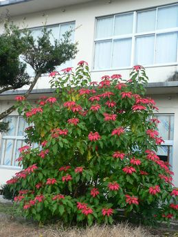 12月といえばクリスマスですが、イチョウの木と対照的に、門から離れた突き当りの場所に、大きなポインセチアがあります。この季節、よく鉢植えのポインセチアは見ますが、サロン館にあるのは、大きな大きな『木』 なんですよ。たぶん、鉢植えしか見たことのない人はビックリするでしょう。