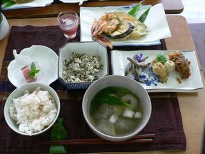 『夏もの揚げ』は、なす・かぼちゃ・へちま・野ユリの花の天ぷらと、魚のすり身を大葉に乗せて揚げたものでした。野ユリの花は、鮮やかなオレンジ色。衣がさくさくとして、抵抗なく美味しく食べられましたよ。