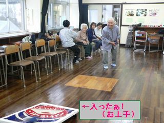 包括支援センターによる『転倒予防』の体操で1時間ほど汗を流された後、ボランティアさんがお持ちくださったBAGGO(バッゴー)というゲームで楽しまれました。これは、1つ240グラムほどの布袋を数メートル先の穴に投げ入れるゲームです。1人4回投げます。そして、入った数を競うのです。ルール自体は、とても簡単なのですが、コントロールが必要になります。